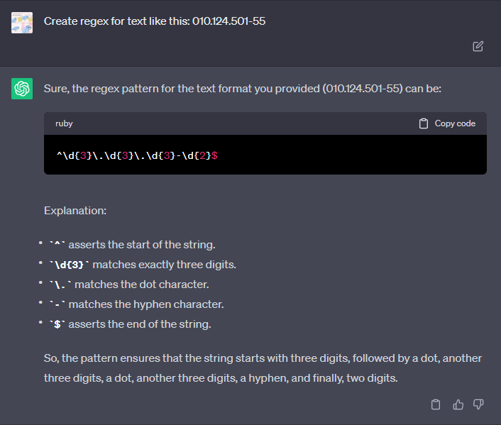 For example, let's say that you want your input to receive an ID number that is structured like this: “010.124.501-55”. If you don’t know how to write regular expressions, you can simply ask any AI bot to do this for you, [ChatGPT](https://chat.openai.com/) for example: