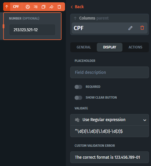 After you get your regular expression, you can input it in the validation field of your component. Click on the component in builder -> Display tab -> Validate -> Use Regular expression
