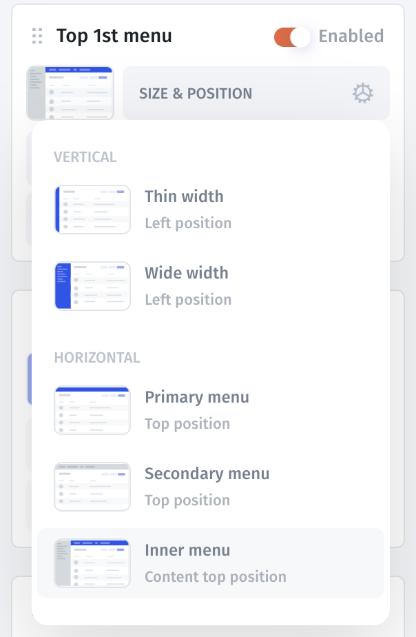 There are two types of menu layouts **Vertical** and **Horizontal.** Each class has different visibility: