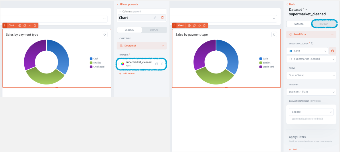 Once you selected the chart type you need to add and configure dataset, simply click **+Add Dataset** and select the resource from which the chart will be built.&#x20;