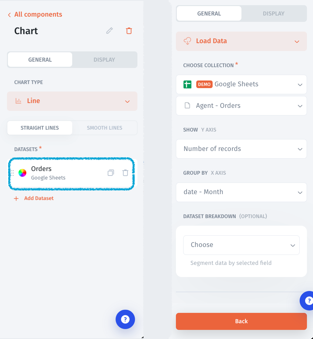 For any given chart, you will need set up the chart settings *and* the dataset settings – access the chart menu by clicking on the chart, and then within that menu you can access the data settings by clicking on the dataset (of which there can be more than one):