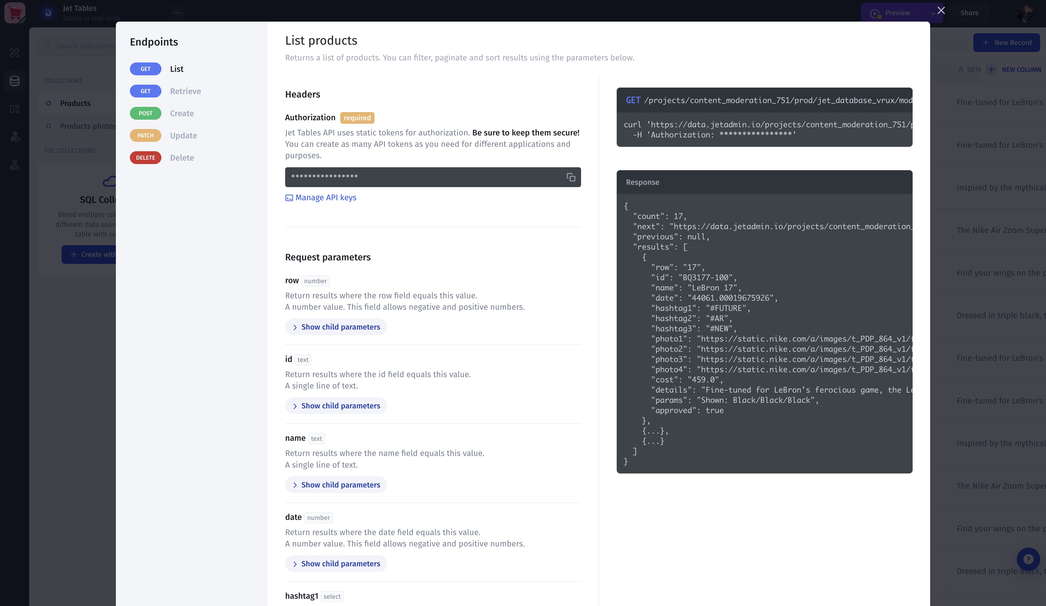 Jet Admin API makes extending your apps and accessing Jet Admin outside of the app easy. In just a few clicks, you can access lists of records and individual records, create new rows, or update/delete existing ones through a RESTful interface. Make working with data more efficient in no time!